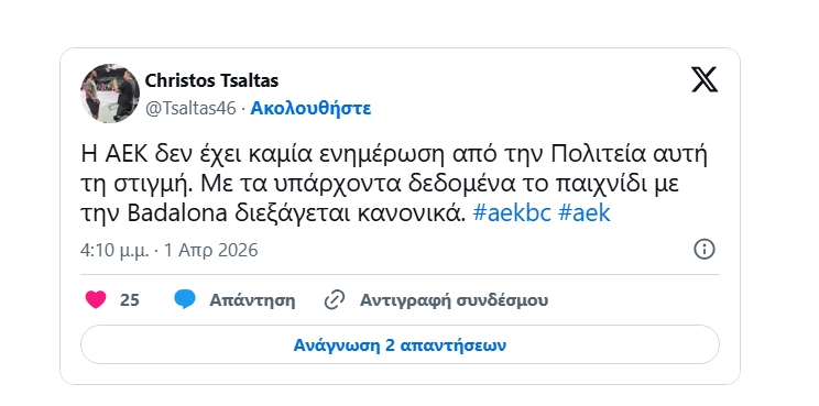 Την ίδια ώρα υπάρχει απορία για την αναμέτρηση της ΑΕΚ με την Μπανταλόνα, για τα προημιτελικά του BCL. Είναι η πρώτη αναμέτρηση των δύο ομάδων και οι απορίες σχετικά με την διεξαγωγή του αγώνα είναι πολλές.