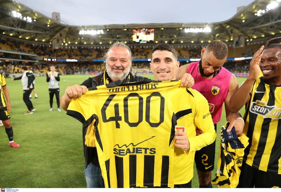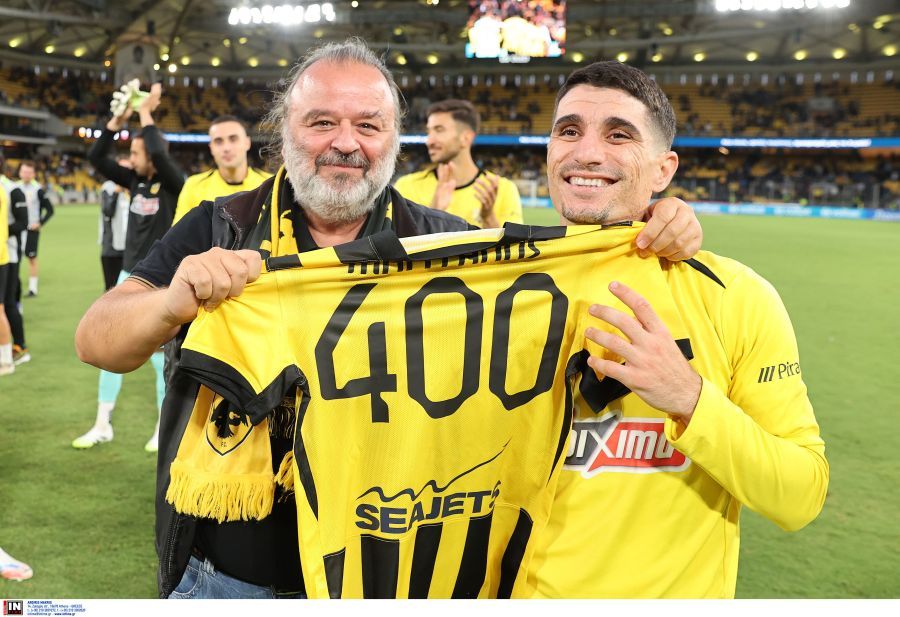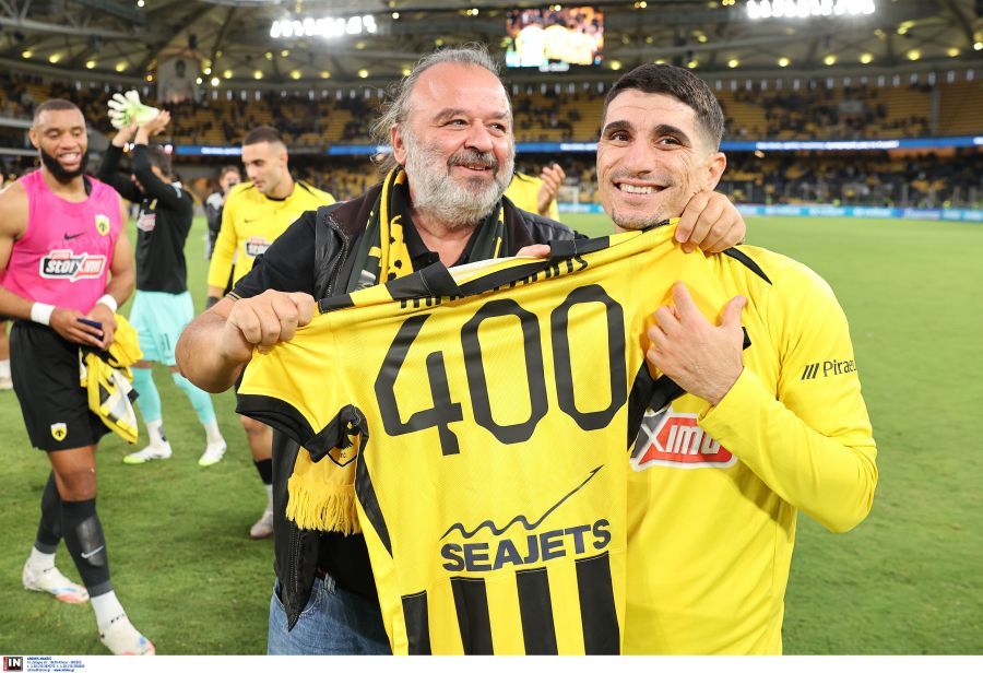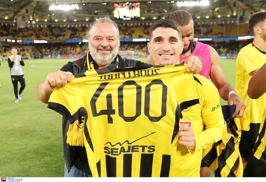 Ο διοικητικός ηγέτης της ΑΕΚ, Μάριος Ηλιόπουλος, πλησίασε τον Πέτρο Μάνταλο μετά τη νίκη (1-0) με τον Βόλο και του έδωσε φανέλα με το νούμερο 400 στο πίσω μέρος της προς τιμήν των εμφανίσεων που έχει ο αρχηγός της Ένωσης.