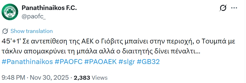 Απίθανο σχόλιο Παναθηναϊκού για το πέναλτι Γιόβιτς και το 0-2 της ΑΕΚ