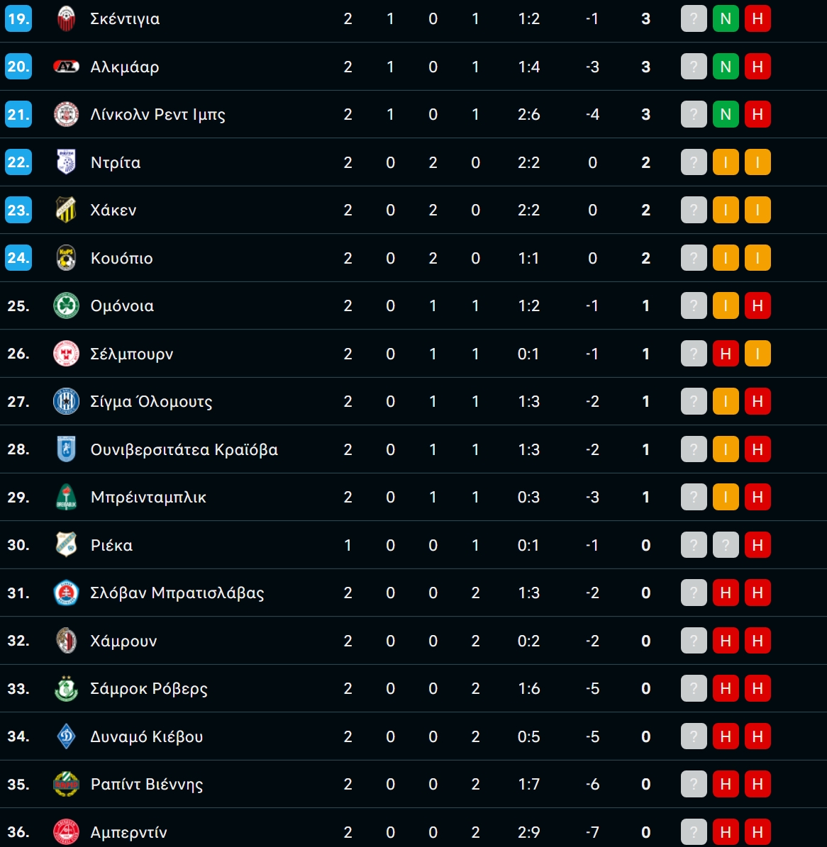 Η βαθμολογία της League Phase μετά την ολοκλήρωση της 2ης αγωνιστικής – Σε ποια θέση βρίσκεται η ΑΕΚ!