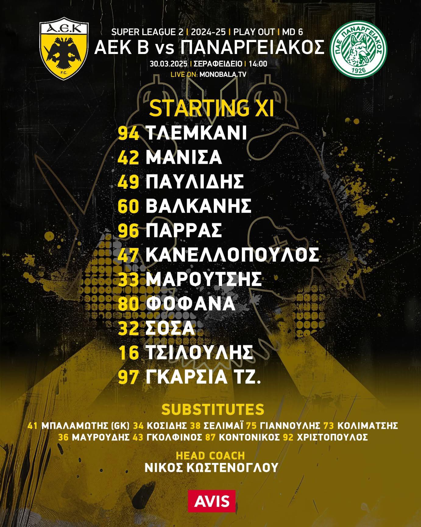 Αναλυτικά η ενδεκάδα της ΑΕΚ Β’: Τλεμκανί, Μανίσα, Παυλίδης, Βαλκάνης, Παρράς, Κανελλόπουλος, Μαρούτσης, Φοφανά, Σόσα, Τσιλούλης, Τζούντα Γκαρσία.
