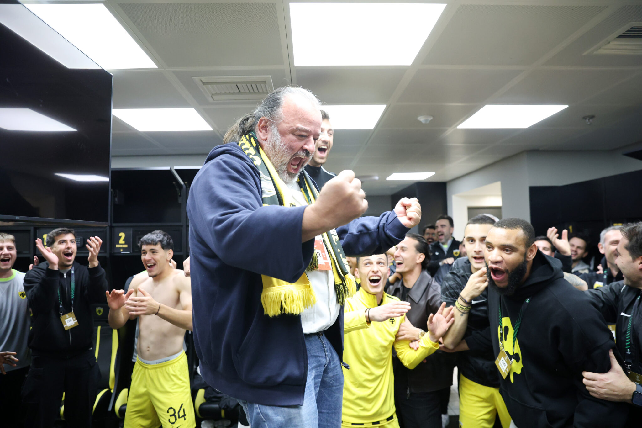 Στα αποδυτήρια τα… έσπασε ξεσπώντας σε έξαλλους πανηγυρισμούς αγκαλιά με τον Αρόλντ Μουκουντί και όλους τους παίκτες της Ένωσης.