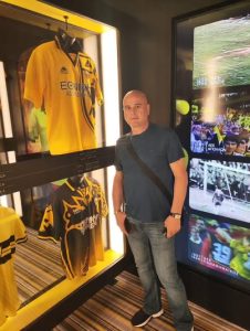Περιηγήθηκε στις προθήκες του και φωτογραφίστηκε μπροστά από τη φανέλα που φορούσε στον θριαμβευτικό τελικό του Κυπέλλου Ελλάδας 1996, στον οποίο είχε μάλιστα σημειώσει ένα από τα συνολικά 24 γκολ του με την ΑΕΚ