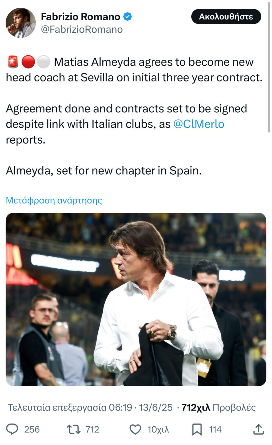 Συμφωνία του Ματίας Αλμέιδα με τη Σεβίλλη, για τριετές συμβόλαιο, αποκαλύπτει ο Φαμπρίτσιο Ρομάνο, τονίζοντας πως αυτός θα είναι ο επόμενος προορισμός του.