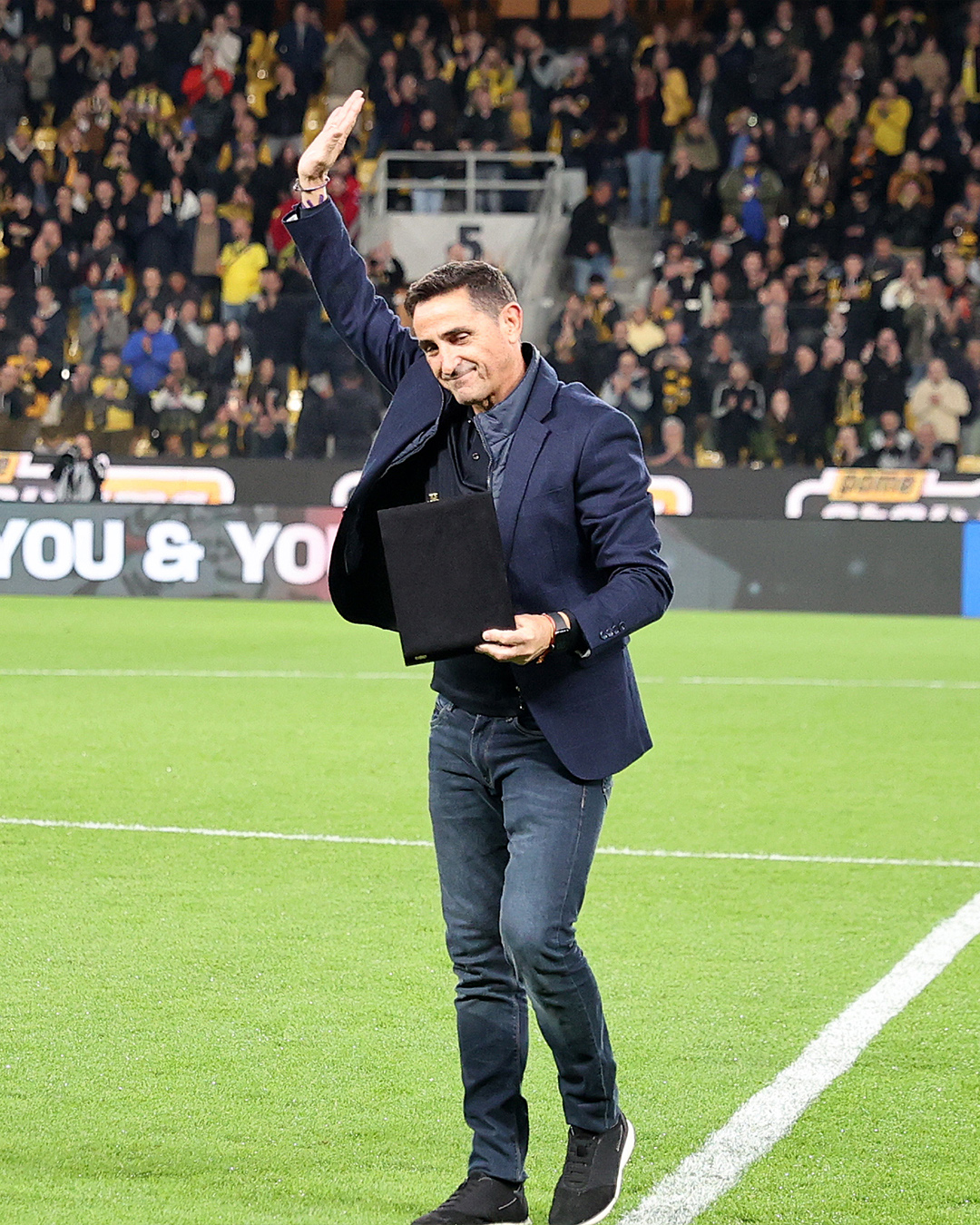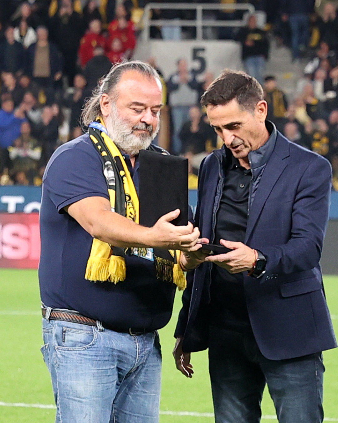 O Μανόλο Χιμένεθ τιμήθηκε για την προσφορά του από τον διοικητικό ηγέτη της ΠΑΕ ΑΕΚ Μάριο Ηλιόπουλο – Με το κασκόλ της ORIGINAL στο λαιμό πήγε στο πέταλο για να παραλάβει ανθοδέσμη από τους οργανωμένους και να γνωρίσει εκ νέου αποθέωση!