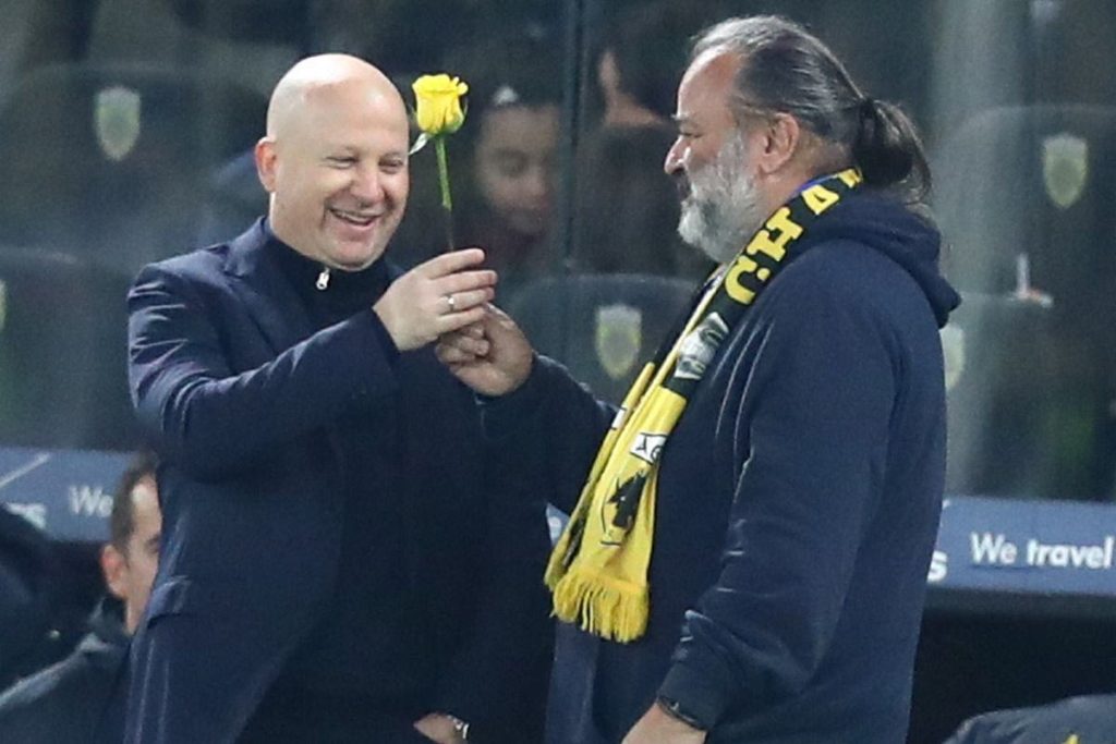 Ο Μάριος Ηλιόπουλος, όπως συνηθίζει, κατέβηκε στον αγωνιστικό χώρο για να πανηγυρίσει με τους παίκτες και τον Μάρκο Νίκολιτς. Αυτό που δεν συνηθίζει το αφεντικό της κιτρινόμαυρης ΠΑΕ είναι να δίνει λουλούδια. Ένα τέτοιο, ένα κίτρινο τριαντάφυλλο, έδωσε στον Σέρβο τεχνικό της Ένωσης.