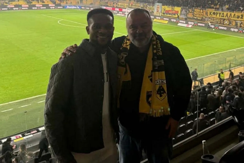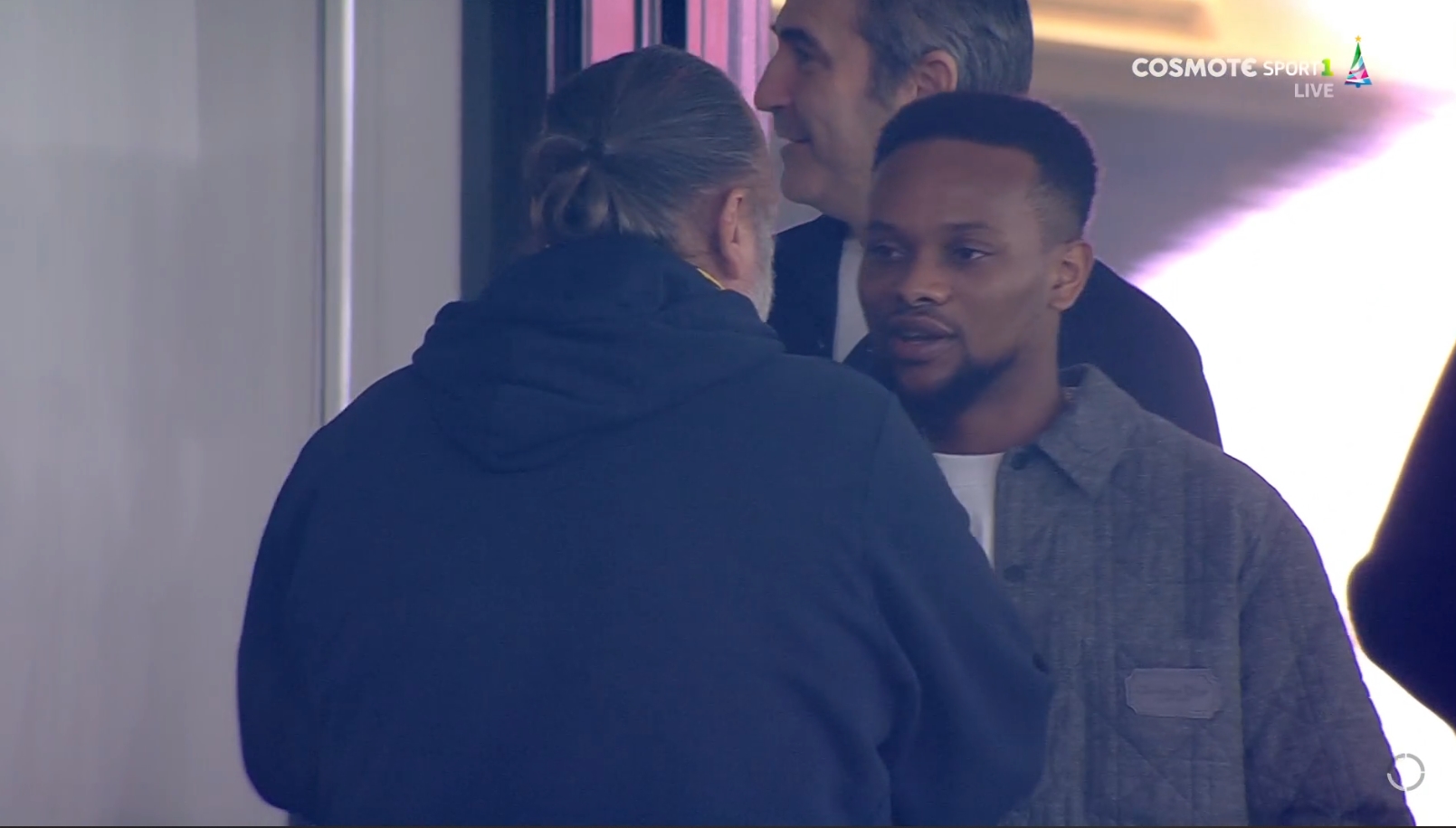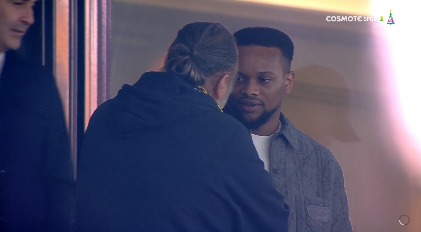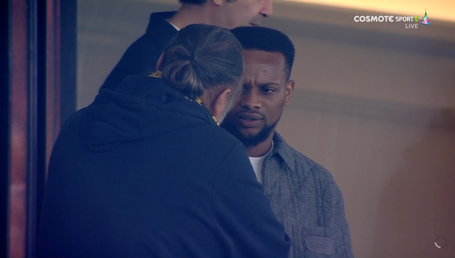 Η τηλεοπτική κάμερα έπιασε τον διεθνή φορ από το Τρινιντάτ και Τομπάγκο να έχει ένα σύντομο τετ-α-τετ με τον Μάριο Ηλιόπουλο στη σουίτα του ιδιοκτήτη της κιτρινόμαυρης ΠΑΕ.
