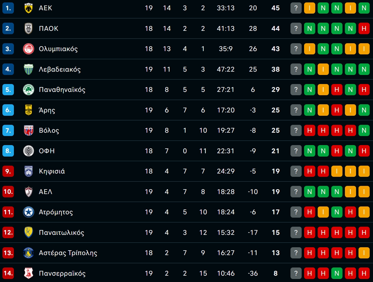Η βαθμολογία της Stoiximan Super League μετά την ισοπαλία της ΑΕΚ με Ολυμπιακό με 1-1!