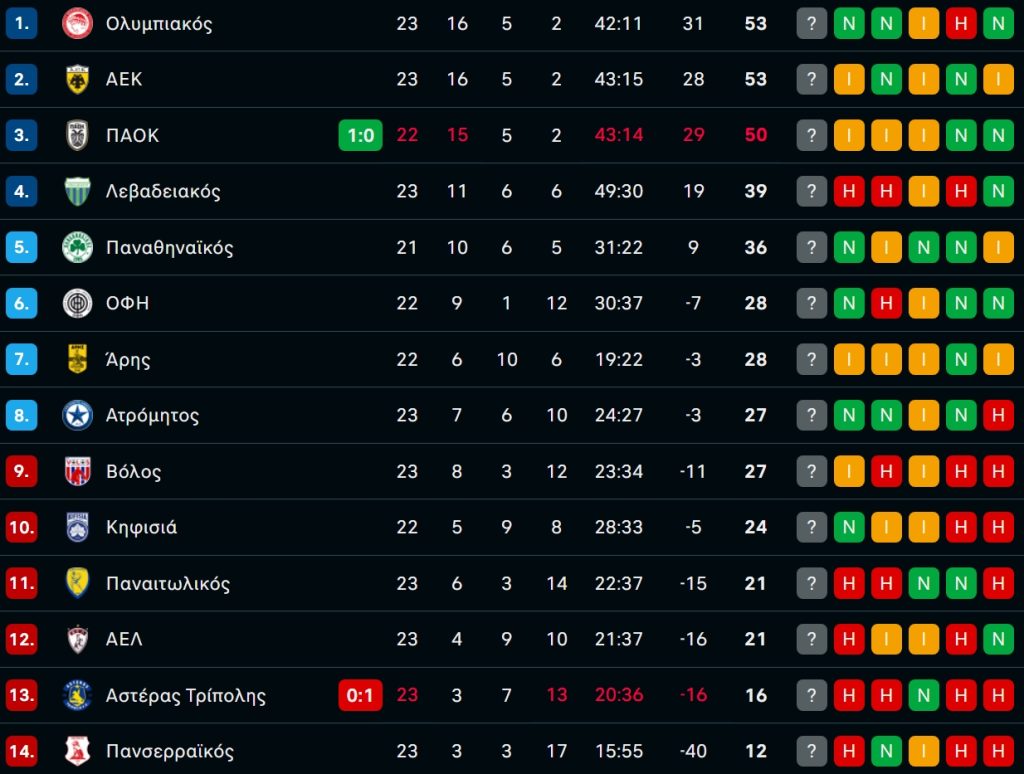 Η βαθμολογία της Stoiximan Super League μετά την ισοπαλία της ΑΕΚ με Βόλο!
