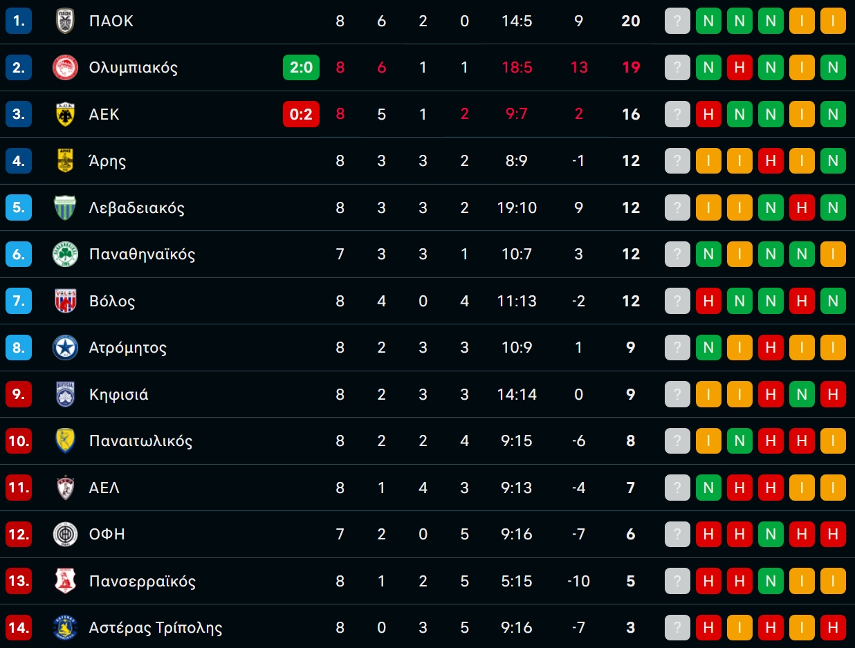 Η βαθμολογία της Stoiximan Super League μετά την ήττα της ΑΕΚ από τον Ολυμπιακό με 1-0.