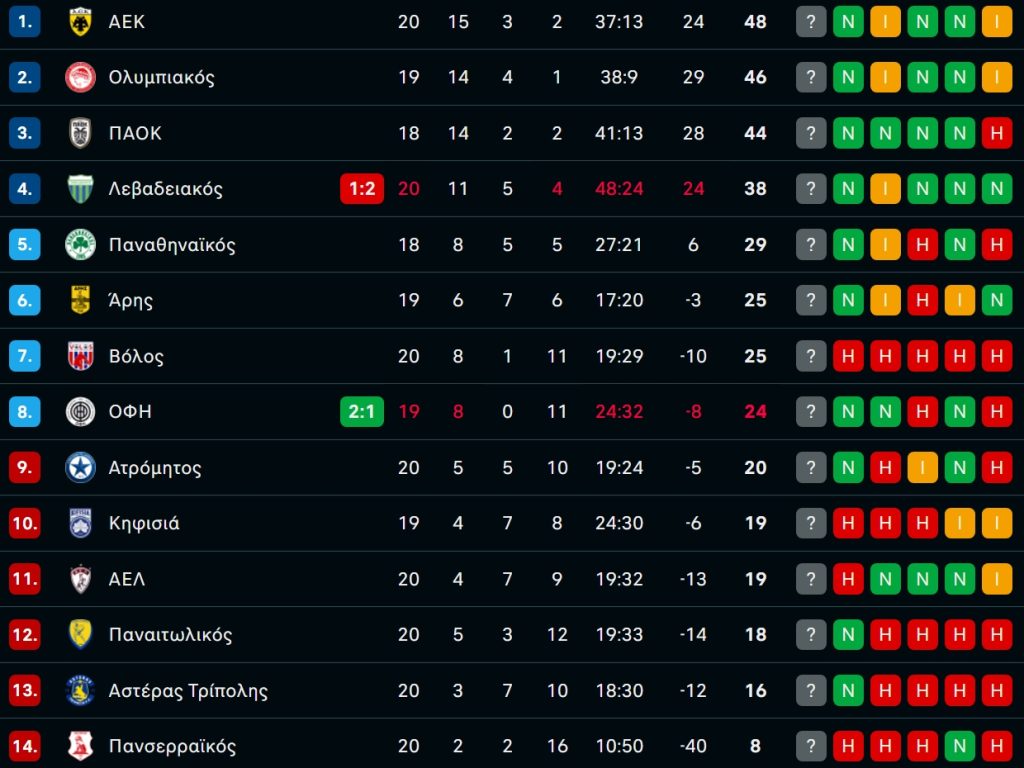 Η βαθμολογία της Stoiximan Super League μετά την νίκη της ΑΕΚ με Πανσερραϊκό με 4-0!