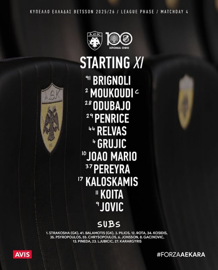 Η ενδεκάδα της ΑΕΚ: Μπρινιόλι, Οντουμπάτζο, Ρέλβας, Μουκουντί, Πενράις, Περέιρα, Γκρούγιτς, Ζοάο Μάριο, Καλοσκάμης, Κοϊτά, Γιόβιτς.