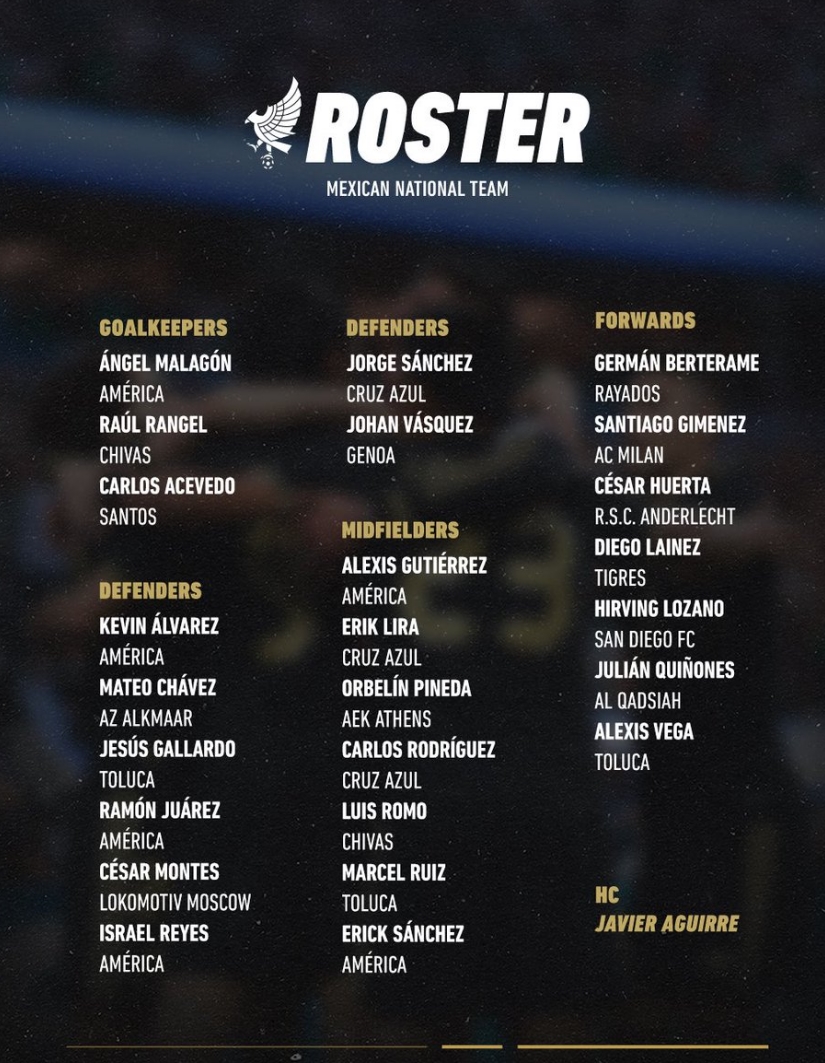 Η 25μελής αποστολή του Μεξικού περιλαμβάνει αρκετά νέα πρόσωπα λόγω τραυματισμών βασικών παικτών. Ο Αγκίρε κάλεσε τον Λουίς Κινιόνες από τη Σαουδική Αραβία, τον Λουίς Ρόμο, τον Κέβιν Άλβαρες και τον Κάρλος Ασεβέδο, που επιστρέφουν ύστερα από καιρό.
