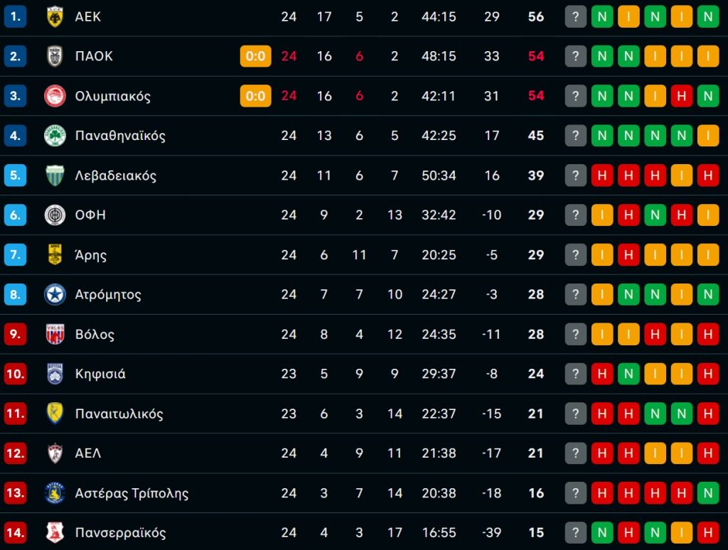 ΜΟΝΗ ΠΡΩΤΗ Η ΑΕΚ: Η βαθμολογία της Stoiximan Super League μετά την ισοπαλία στο Ολυμπιακός-ΠΑΟΚ!