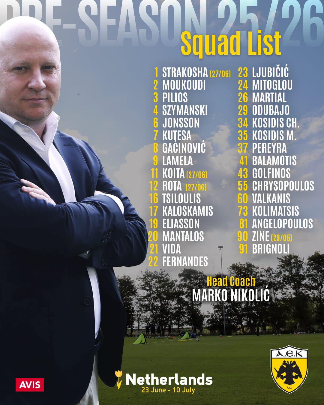 Ανακοινώθηκε η αποστολή της ΑΕΚ για την Ολλανδία. Η Ένωση αναχωρεί για την Ολλανδία τη Δευτέρα (23/6). Θα πραγματοποιήσει το βασικό στάδιο της προετοιμασίας της στο Burgh-Haamstede και στο προπονητικό κέντρο της FC de Westhoek και θα επιστρέψει στην Αθήνα στις 10 Ιουλίου.